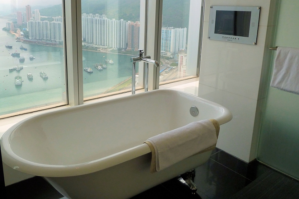 33 Un bain mousseux en regardant la T.V. ou la vue sur la baie